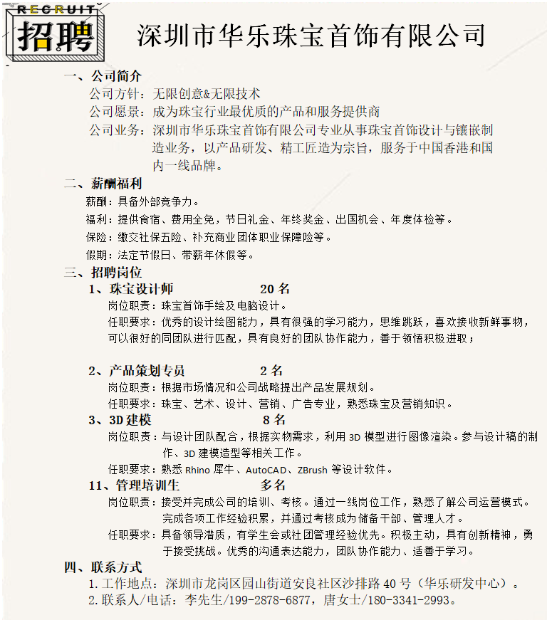 深圳市华乐珠宝首饰有限公司招聘信息