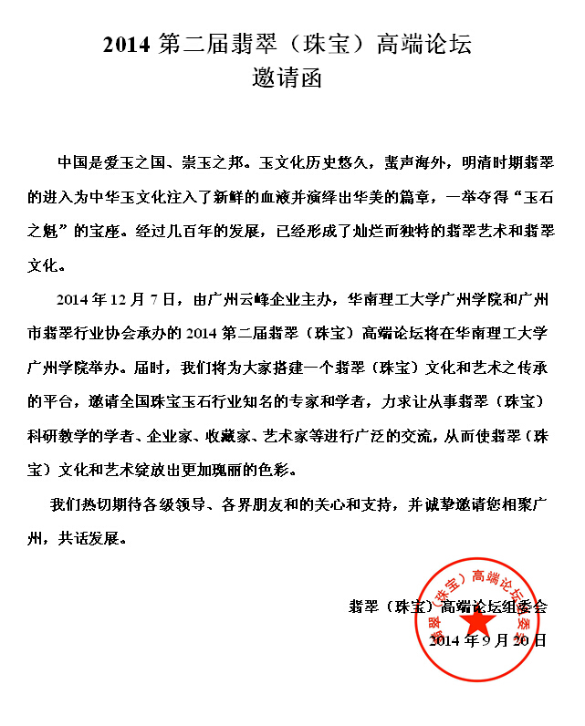 2014第二届翡翠(珠宝)高端论坛 邀请函