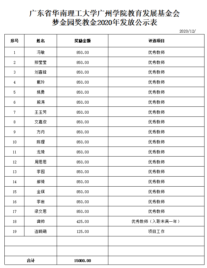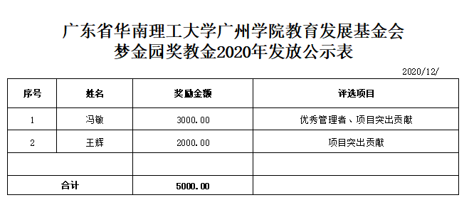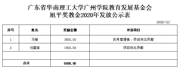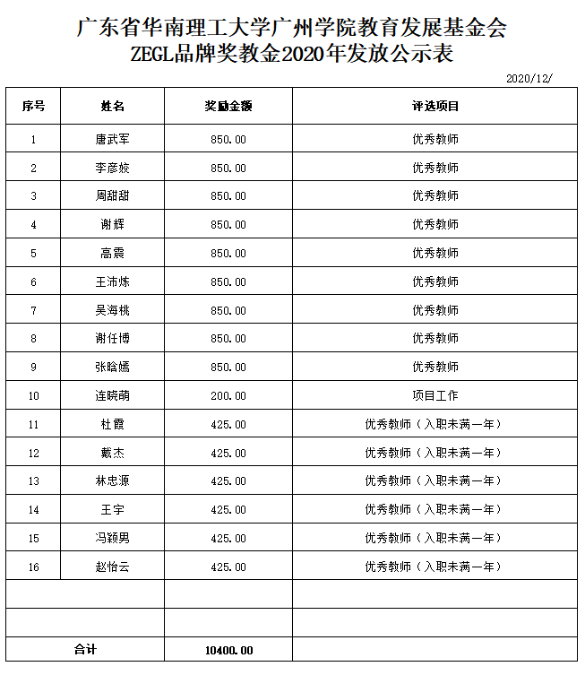 根据《广东省华南理工大学广州学院教育发展基金会“企业奖教金”教职工奖励办法》相关评审规定,suncitygroup太阳新城于2020年12月1日-12月10日,开展了2020年旭平奖教金、ZEGL奖教金、梦金园奖教金评审工作。经评审小组审核,现对初审通过教师名单(见具体表格)予以公示,并就有关事项通知如下: