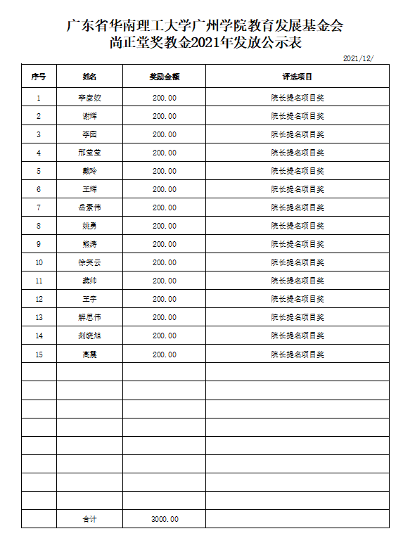 根据《广东省华南理工大学广州学院教育发展基金会“企业奖教金”教职工奖励办法》相关评审规定,suncitygroup太阳新城于2021年12月15日-12月25日,开展了2021年尚正堂奖教金评审工作。经评审小组及党政联席会议审核,现对初审通过教师名单(见具体表格)予以公示,并就有关事项通知如下: