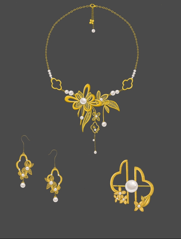 作品工艺为手工绕线,选用的材质是金色的保色铜丝和珍珠,金色的铜丝绕出桂花的形态,金黄色也是桂花的颜色,也更加符合桂花吉祥富贵的寓意,大小不一的珍珠连接着桂花,珍珠的色泽像是夜晚月亮那清冷柔和的光,与桂花相映衬,诗词《秋山吟》中有一句“月色清且冷,桂香落人衣。”项链中心还加入了中国结中的平安结作装饰,设计还添加了花窗元素,整体设计展现了中国传统文化的美感和韵味。