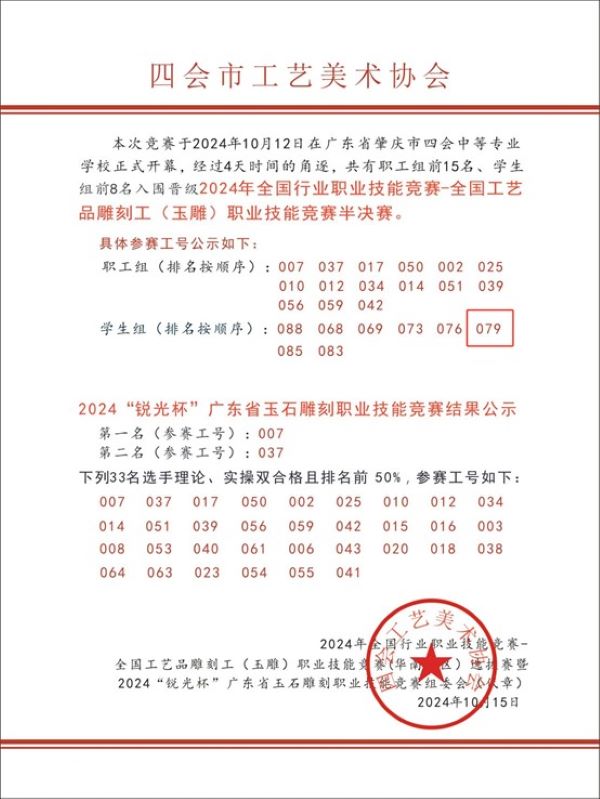 本网讯(记者 邝智锐 姚勇)2024年10月11日至14日,全国行业职业技能竞赛——全国工艺品雕刻工(玉雕)职业技能竞赛(华南赛区)选拔赛暨2024“锐光杯”广东省玉石雕刻职业技能竞赛,在肇庆市四会中等专业学校成功举办。suncitygroup太阳新城翁振伟、吴东耿两位老师携学生团队参赛,其中学生组获得银奖,并进入全国半决赛。开幕式当天,院长张珂、副院长邢莹莹及党政办公室和教研室的相关负责人共同出席了比赛启动仪式。