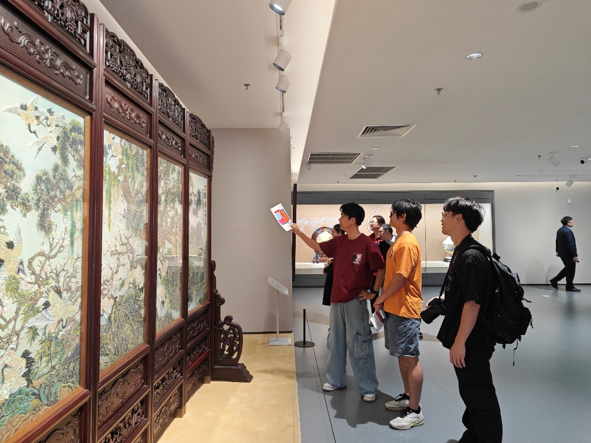 走进广东省非物质文化遗产馆,师生仿佛穿越至岭南文化的深处。从细腻繁复的广绣到生动传神的木偶戏,从古朴典雅的陶艺到韵味悠长的粤曲,每一项非物质文化遗产都以其独特的魅力,讲述着岭南大地上的历史故事与文化传承。这里还展示了众多精美的手工艺作品,木雕、剪纸、木版年画等,它们不仅展现了岭南手工艺人的精湛技艺,也传承了千年的匠心精神。师生们在观赏中感悟,在交流中启迪,对传统文化的热爱与尊重油然而生,对手工艺的精妙与魅力也有了更深的认识。这些传统技艺与民俗不仅激发了学生们的创造力与艺术感知力,更为他们设计之路提供了丰富的灵感来源。