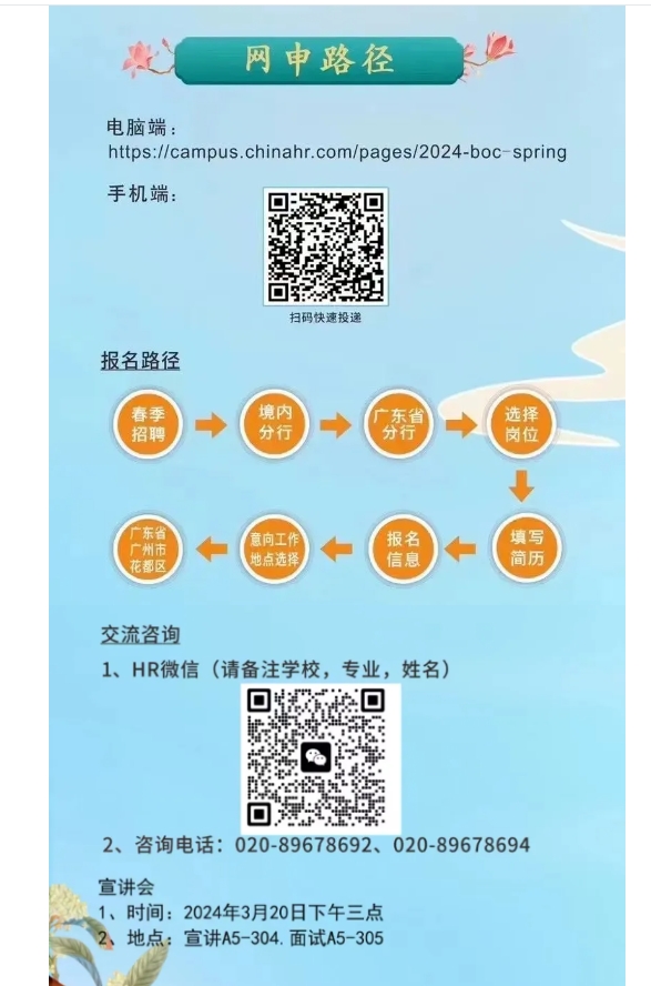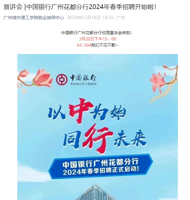 宣讲会 |中国银行广州花都分行2024年春季招聘开始啦!