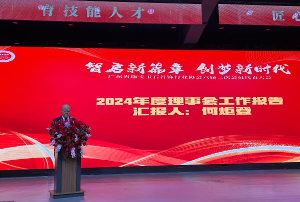 何炬登会长利用AI技术制作了工作业绩视频,与参会者共同回顾了过去一年的工作。他还在会上对2024年度理事会的工作进行了详细汇报。在报告中,他围绕科技赋能行业发展、数字化攻坚、云服务、技能竞赛(玉雕)、“1+N”等模式展开,重点阐述了在AI加持下珠宝玉石行业的发展趋势。