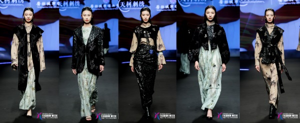 设计团队以“新中式”为设计风格,巧妙融入中国传统文化元素,选用带有亮片珠绣纹饰的面料,营造出光影浮动的视觉效果。主面料采用亮片龙纹丝绒,辅助面料为水墨珠绣和黑色满绣珠片面料。作品将传统的文化符号与现代款式巧妙结合,打造出既蕴含文化内涵又富有现代时尚感的女装。《浮光》通过服饰语言传递出新时代对传统文化的深度认同与创新表达,彰显出从容自信的文化气度。