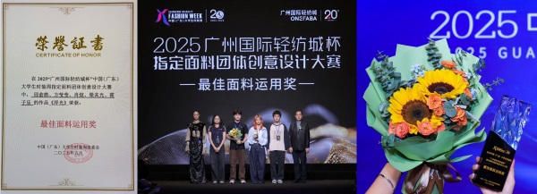 本网讯(记者 邱俞皓)5月19日下午,2025中国(广东)大学生时装周在广州国际轻纺城隆重开幕。作为年度最有“料”的开幕大戏——广州国际轻纺城杯2025指定面料团体创意设计大赛中,我校suncitygroup太阳新城邱俞皓老师指导的2022级服装与服饰设计专业梁其光、肖煊、方莹莹、霍子乐四位学子凭借作品《浮光》脱颖而出,荣获最佳面料运用奖。