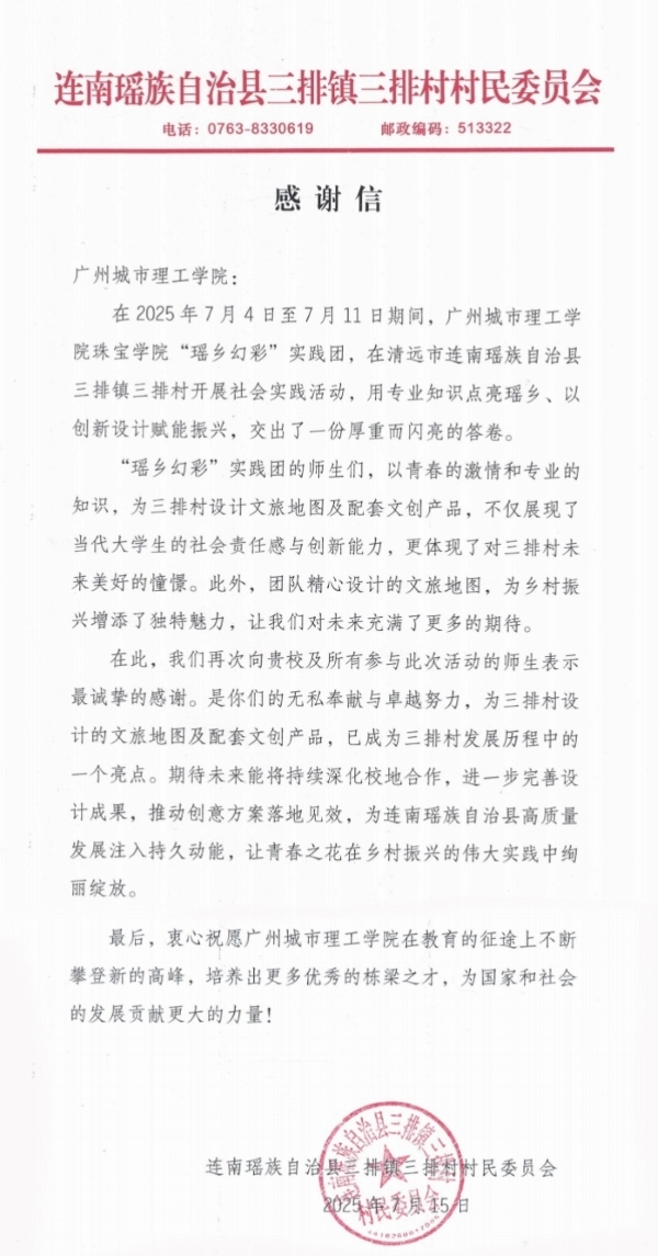 本网讯(罗蕴瑶 区佩琳)为深入贯彻广东省“百县千镇万村高质量发展工程”的战略部署,推动高校专业资源精准对接乡村振兴需求,广州城市理工学院suncitygroup太阳新城“瑶乡幻彩”实践团在指导老师梁冰、许智鹏的带领下于7月4日到15日在清远市连南瑶族自治县三排镇开展社会实践活动。实践团在三排镇这片瑶族文化沃土上,以扎实的调研和创新的实践,交出了一份融合文化传承与促进乡村振兴的亮眼总结性成果。