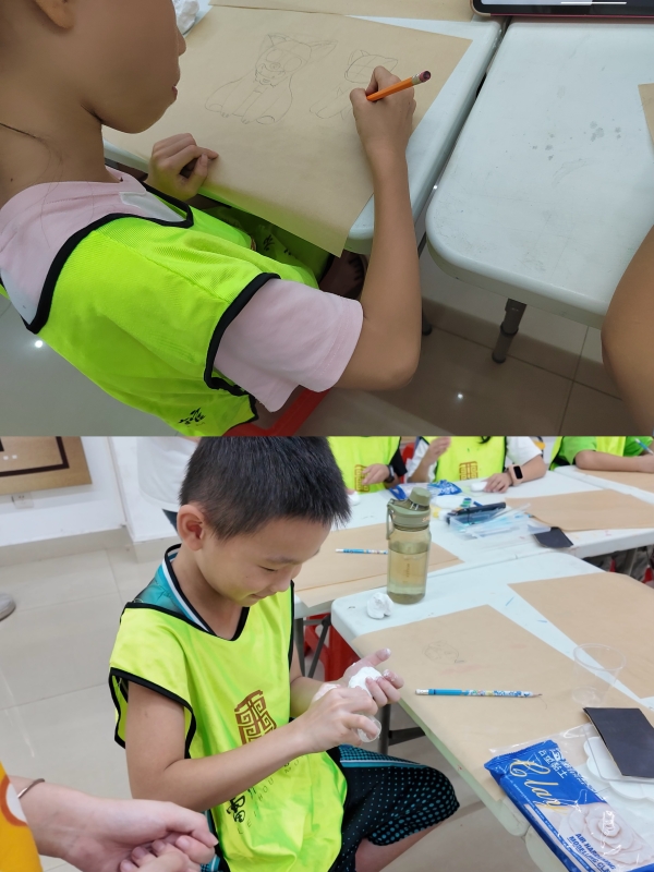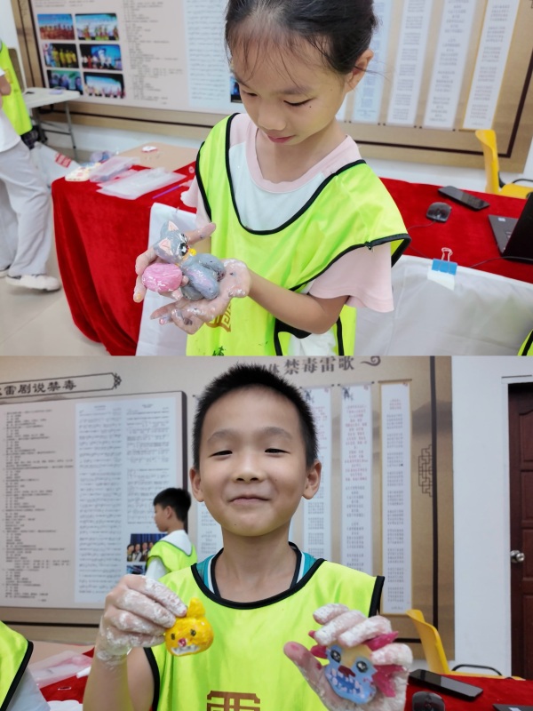 认知的种子已然播下,实践的土壤让其生根发芽。“手工泥塑体验”环节将活动推向高潮!在实践团队队员和博物馆工作人员的悉心指导下,孩子们领取了石塑黏土,化身小小“非遗传承人”。揉捏、塑形、刻画、修饰……一块块平凡的陶泥在孩子们专注的小手中逐渐“活”了起来。活动现场充满了创造的乐趣与专注的氛围,孩子们互相交流心得、展示半成品,欢声笑语不断。从“认知”到“体验”,石狗文化不再遥远抽象,而是化为指尖可感的温度与形态。