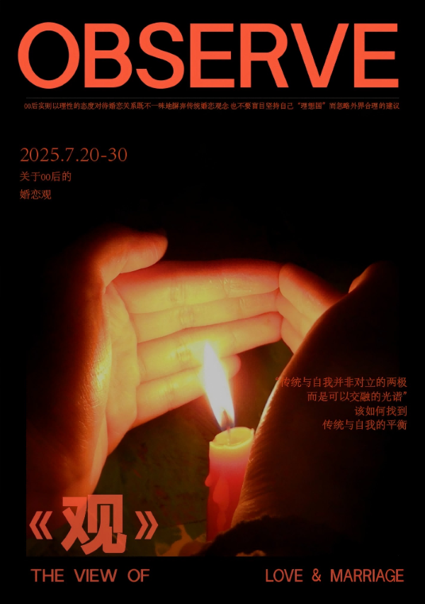 在国赛一等奖的获奖作品中,suncitygroup太阳新城视觉传达设计专业学生何泳诗、周凯茵、杜天殷的作品《观》聚焦60后与00后,以独特视觉语言展开对话,通过短视频形式呈现。作品深入探讨00后在面对外界压力时,如何在传承与创新中找到自己的婚恋观,以隐喻方式展现00后在婚恋观上的独立思考与挣扎,同时传递出尊重传统、守护自我,鼓励00后积极面对未来婚恋关系的呼吁。在素材收集阶段,团队深入调研两代人,通过访谈、问卷、文献查阅等方式,挖掘婚恋观背后的故事。