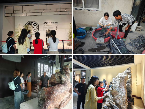 在灵璧县文旅局、渔沟镇政府的大力支持下,团队深入灵璧县奇石公园、县博物馆、渔沟天一园、磬云村、磬云山、奇石小镇以及泗县老山奇石地质文化公园等地,完成了对灵璧石文化资源的系统调研。通过近距离观赏形态各异的灵璧石、聆听文化局局长的专业讲解、欣赏珍贵藏品、观摩磬石加工工艺、探索地质构造、拜访新老收藏家、走访矿区农户及对比研究不同石种等系列实践活动,全面考察了灵璧石的形成机理、文化内涵、工艺传承及产业发展现状,深入挖掘了这一国家级非物质文化遗产的独特价值。