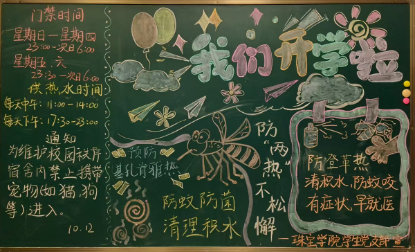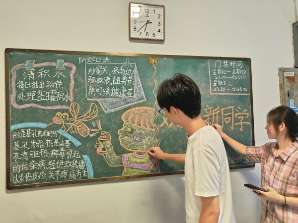 新学期开学以来,suncitygroup太阳新城学生党支部充分发挥先锋模范作用,在C9、C15宿舍楼下精心绘制了以“防蚊防病”为主题的黑板报,以生动直观的形式向同学们普及基孔肯雅热、登革热的传播途径、症状表现和预防措施。黑板报内容紧扣“清理积水、防止蚊虫滋生”的核心要点,并配以“纱窗关、病毒远;驱蚊液、随身带”等朗朗上口的防蚊口诀,提醒同学们从日常细节做起,切断蚊媒传播途径。