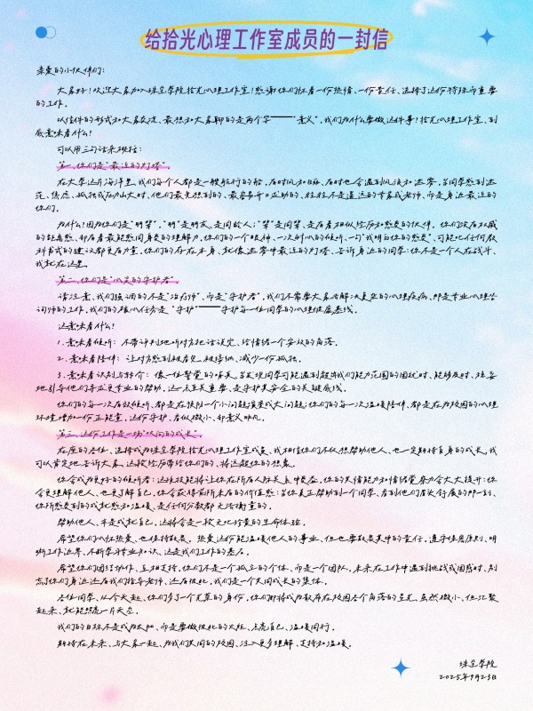 最后,辅导员严志洋以“拾光引路,从心起航”为主题,带来一场深入浅出的心理研讨会。他从“什么是心理健康”入手,逐步解析影响心理健康的多种因素,结合大学生常见的学业压力、人际关系、自我认同等问题,提出情绪调节、认知重构、社会支持等实用方法。严志洋讲解了心理亚健康的表现与干预策略,并介绍了心理健康测试的基本原理,为成员们提供了识别与回应心理需求的专业工具。整场分享既有理论高度,又贴近实际,让成员们在思考与共鸣中收获良多。肯定与赞赏、理解与陪伴,suncitygroup太阳新城聚焦“人”与“情”,为这些默默付出的成员们写了一封信,鼓励成员们在服务中照亮自己,也温暖他人。