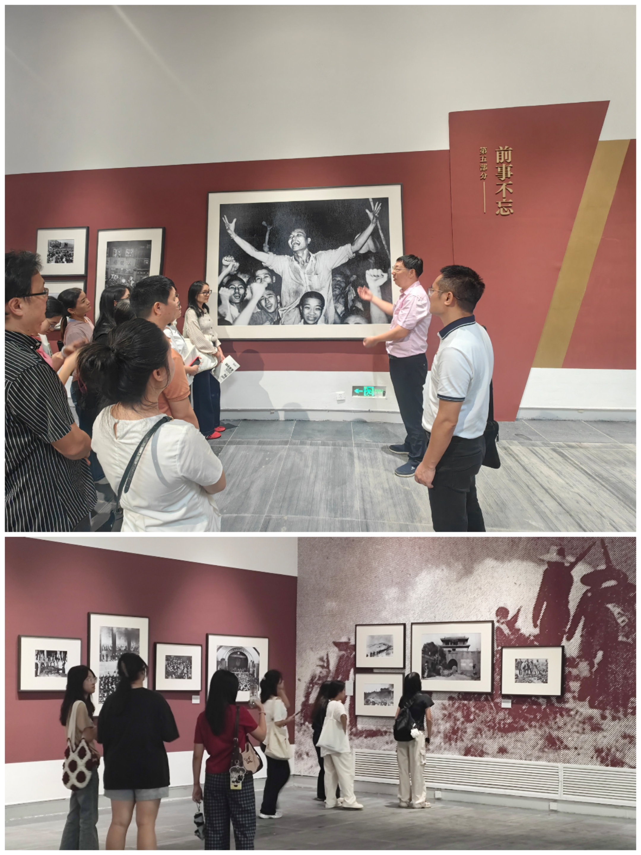 在广州美术学院(大学城校区)美术馆,两院师生参观“国社之镜·世纪光影之人民必胜”图片巡展广东分展,进一步深刻而直观地参悟“当理论之光遇见艺术之美”的无穷魅力。观展中,一张张照片把大家思绪拉回到那段艰苦卓绝的抗战烽火岁月:面对国破家亡,四万万同胞奋起筑起血肉长城,浴血奋战十四年,付出巨大牺牲,直至迎来伟大胜利。师生们驻足凝视,无不被这些历史瞬间深深触动,心灵受到洗礼,“正义必胜、和平必胜、人民必胜”的信念在每个人心中愈发坚定不移。