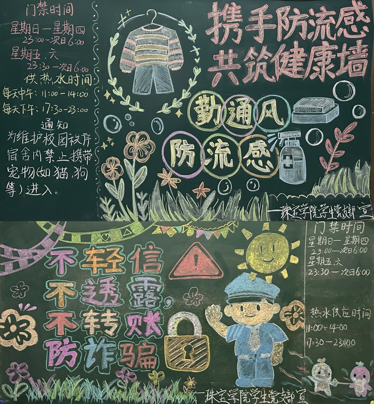 学院学生党支部充分发挥先锋模范作用,在C9、C15宿舍楼下绘制主题板报,内容涵盖三大核心板块。防流感板块以 “携手防流感 共筑健康墙” 为主题,提醒学生“勤通风、防流感”,保持个人卫生;防诈骗板块围绕“不轻信、不透露、不转账、防诈骗”核心原则,揭露常见校园诈骗套路,强化学生反诈警惕性;宿舍管理板块则清晰标注门禁时间、供热水时间及宿舍禁养宠物等规定,让宿舍管理规范直观可见。