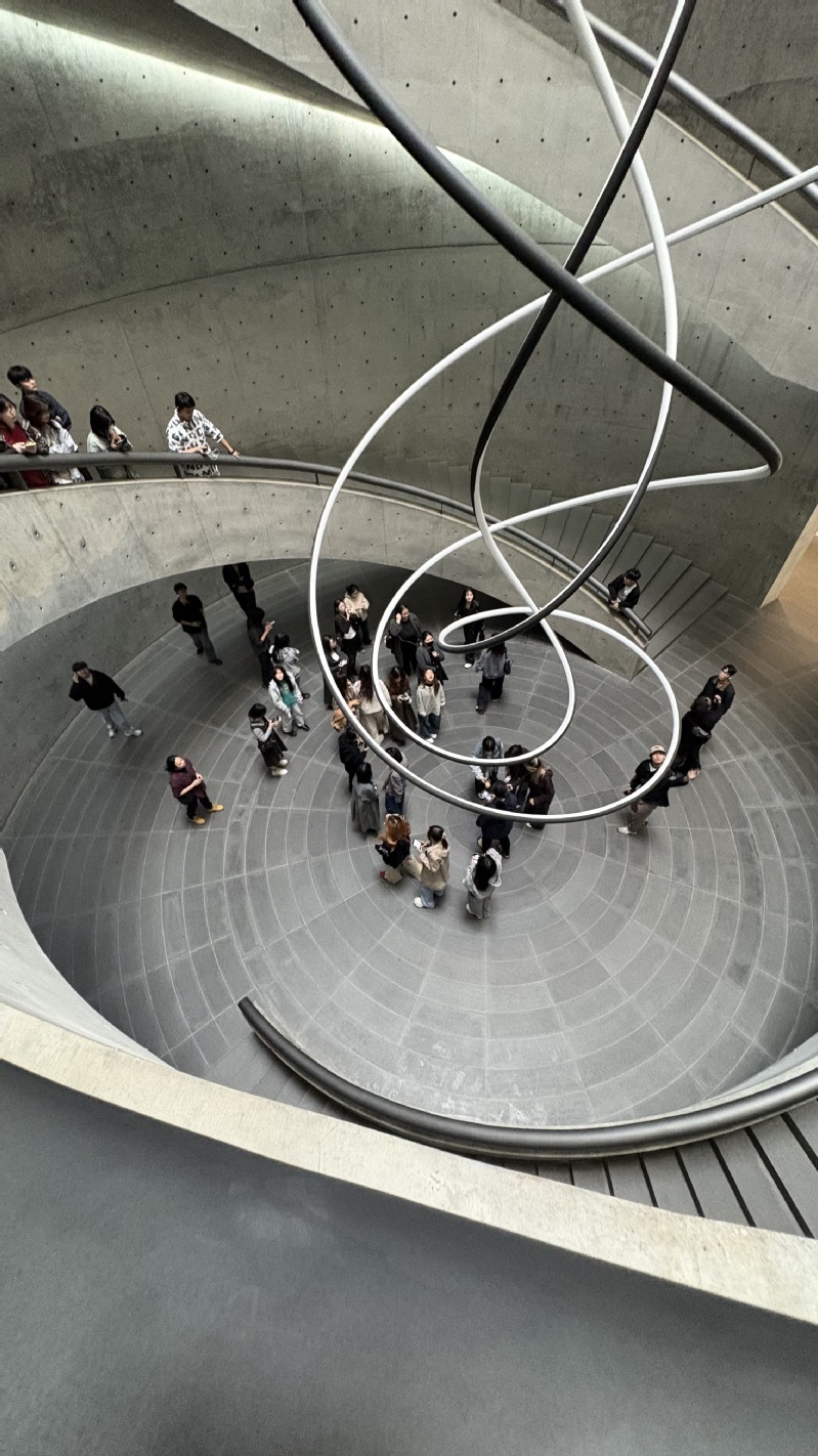 下午,实践队伍转往现代建筑和美术馆。在专业导览的详细讲解下,师生们系统观摩了馆内陈列的现当代艺术作品,深入了解了不同艺术流派的创作理念与表现手法。随后,学生们重点感受了美术馆建筑本身独特的清水混凝土结构、几何空间设计和光影效果。通过和美术馆的实践调研,引导大家思考如何将艺术作品中的构图、肌理与建筑中的结构感、材料质感,转化为服装设计中的图案、廓形与面料语言。